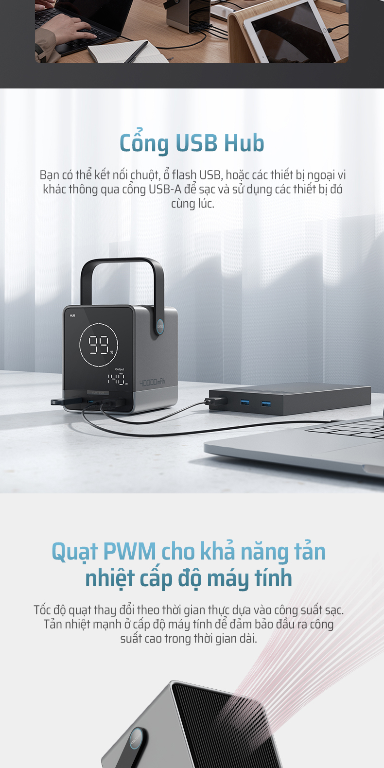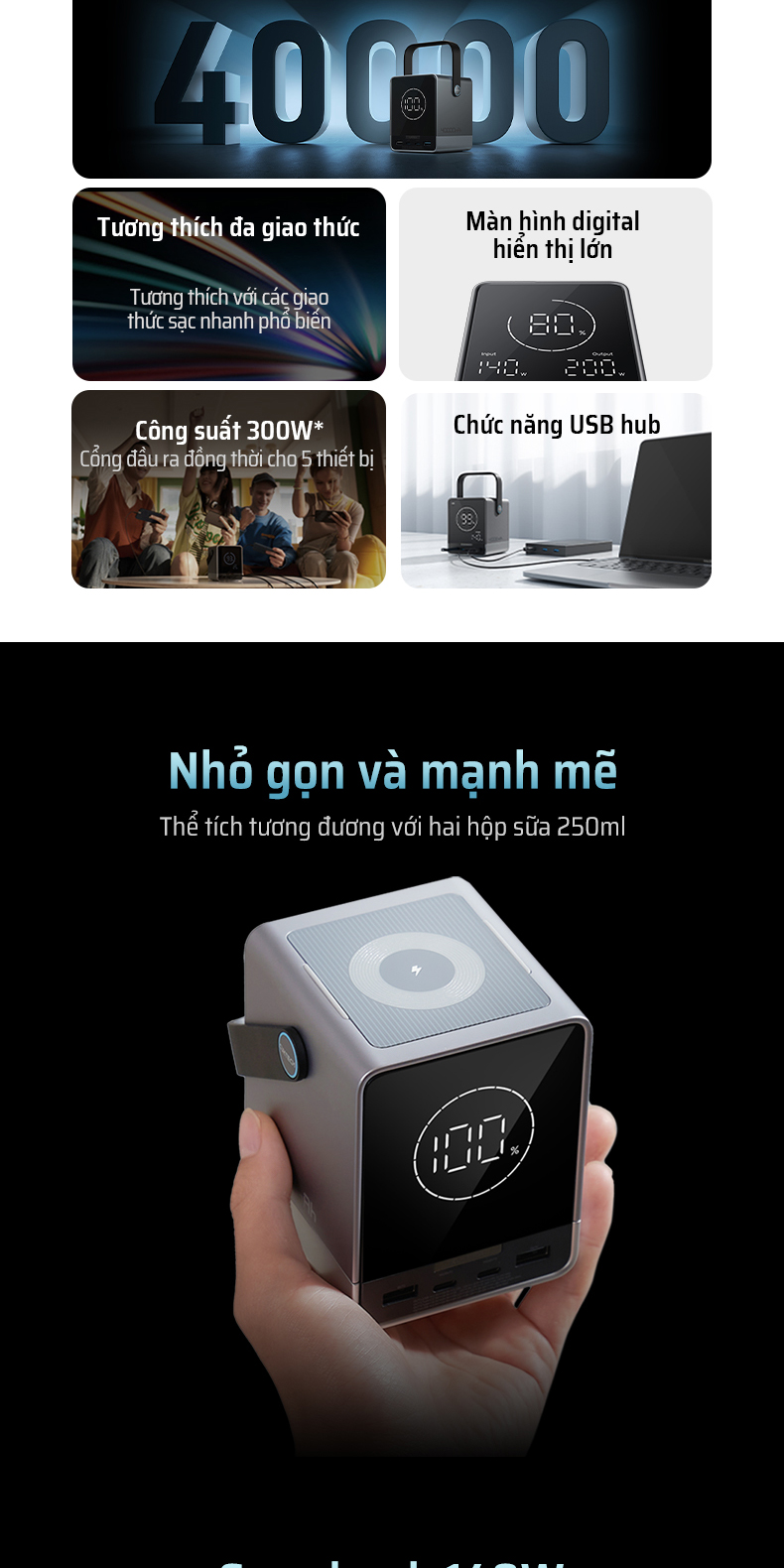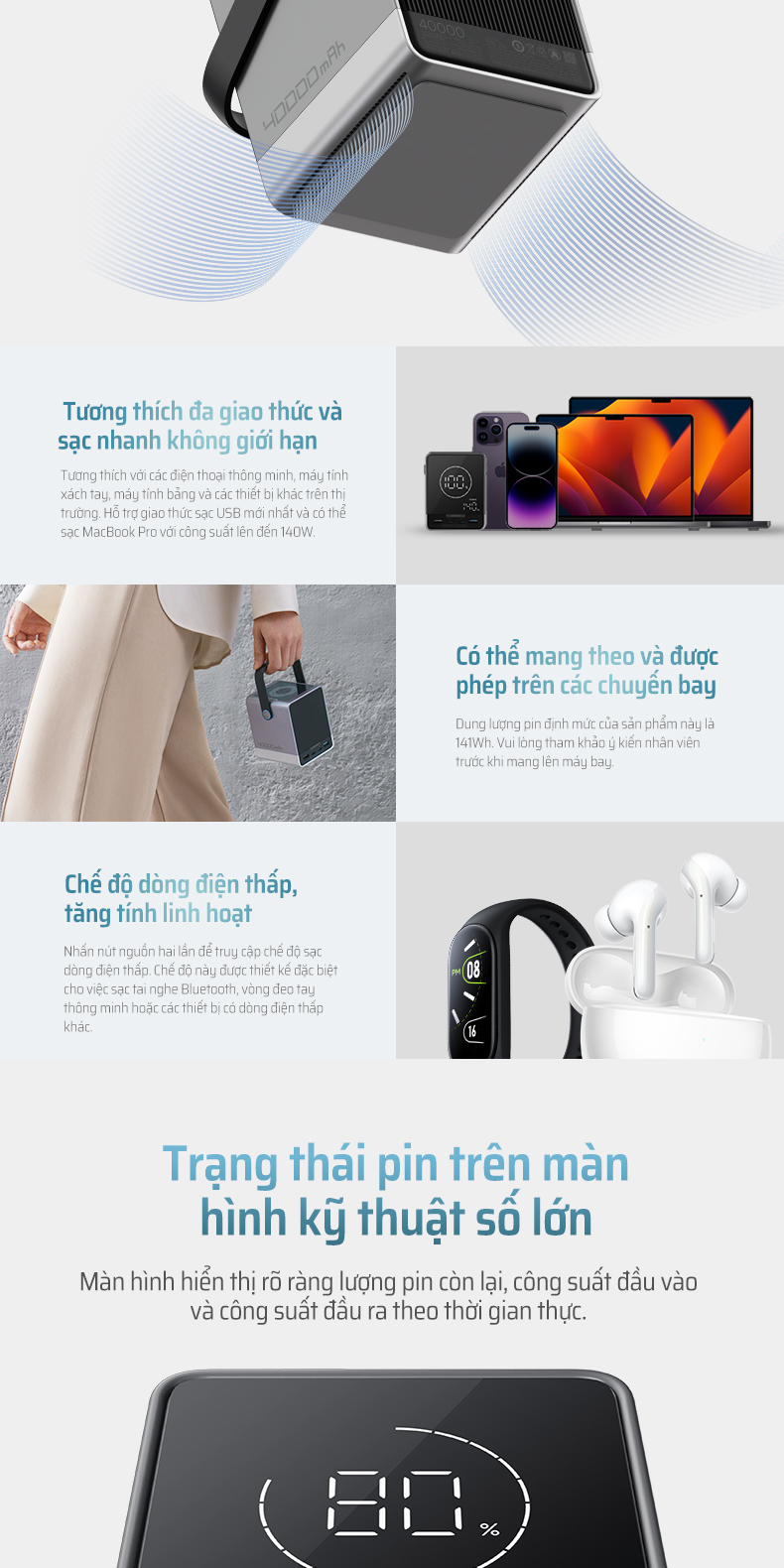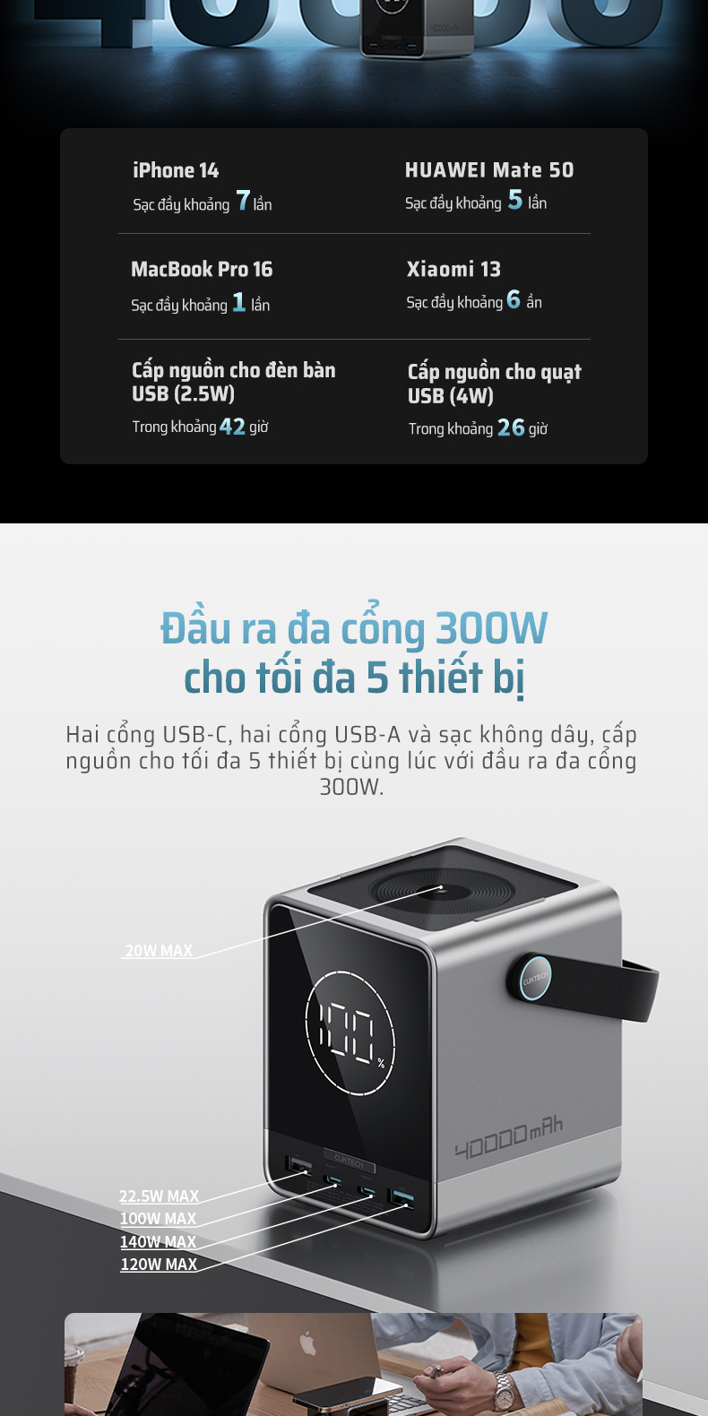 Dung lượng cực lớn 40.000mAh: Một lần sạc, đủ dùng 7 ngày. Đủ để sạc đầy 7 lần một chiếc iPhone 14 hoặc sạc đầy một chiếc MacBook Pro. Lựa chọn hoàn hảo để làm việc ngay cả khi di chuyển, đi du lịch hoặc cắm trại ngoài trời.