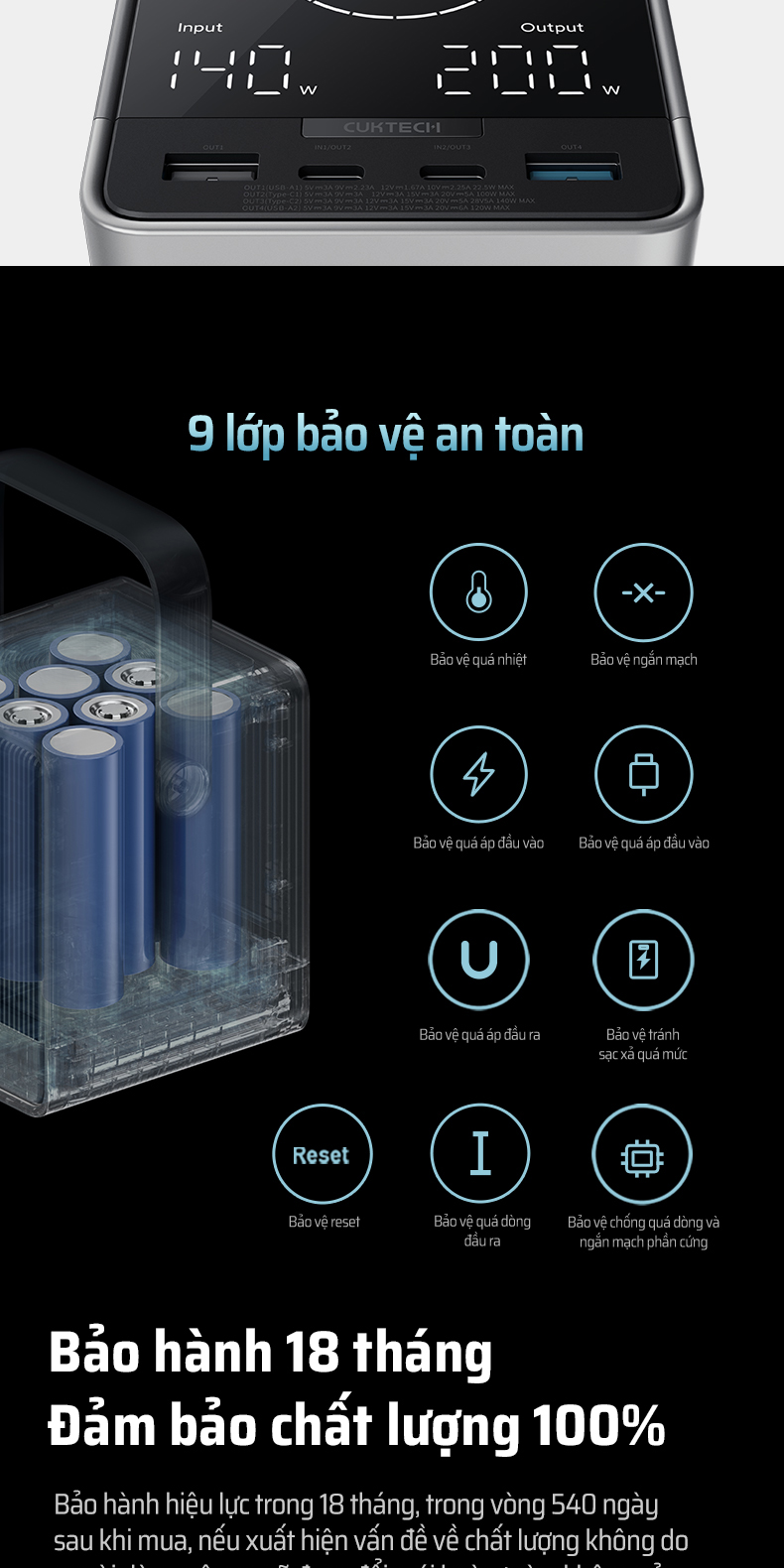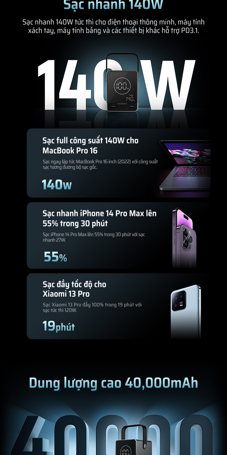 Sạc nhanh 140W hai chiều: Tự sạc nhanh và đầu ra cổng đơn đạt tới mức đáng kinh ngạc 140w, sạc đầy pin dự phòng chỉ trong 2,5 giờ. Tương thích với PD3.1 và các giao thức khác, nó có thể cung cấp cùng mức đầu ra 140W như bộ sạc gốc của chiếc MacBook Pro 16 inch.
