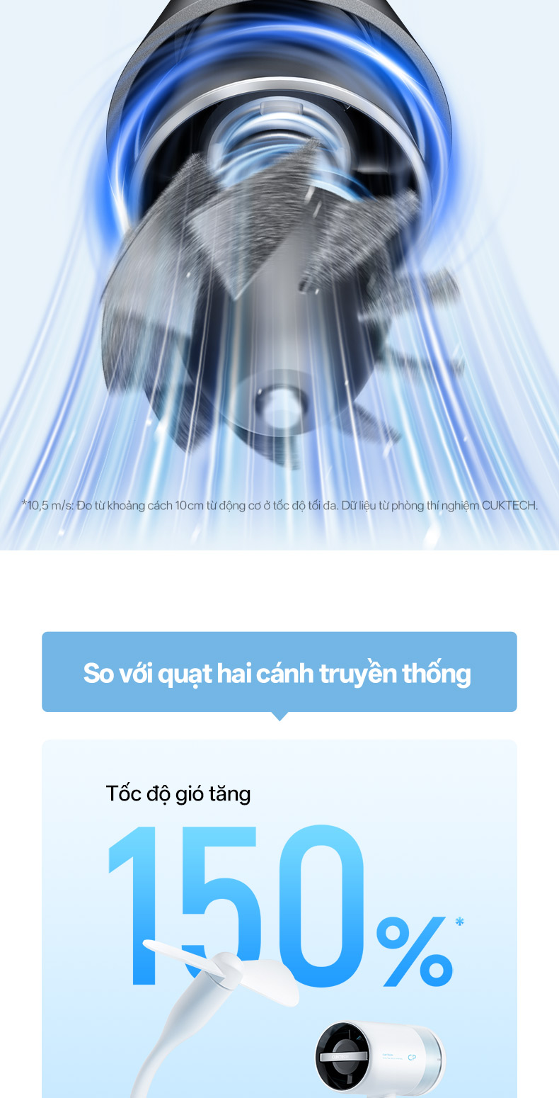 Sử dụng các nguyên lý khí động học, động cơ tập trung và tạo áp suất luồng không khí, đạt tốc độ gió tối đa là 10,5 m/giây.