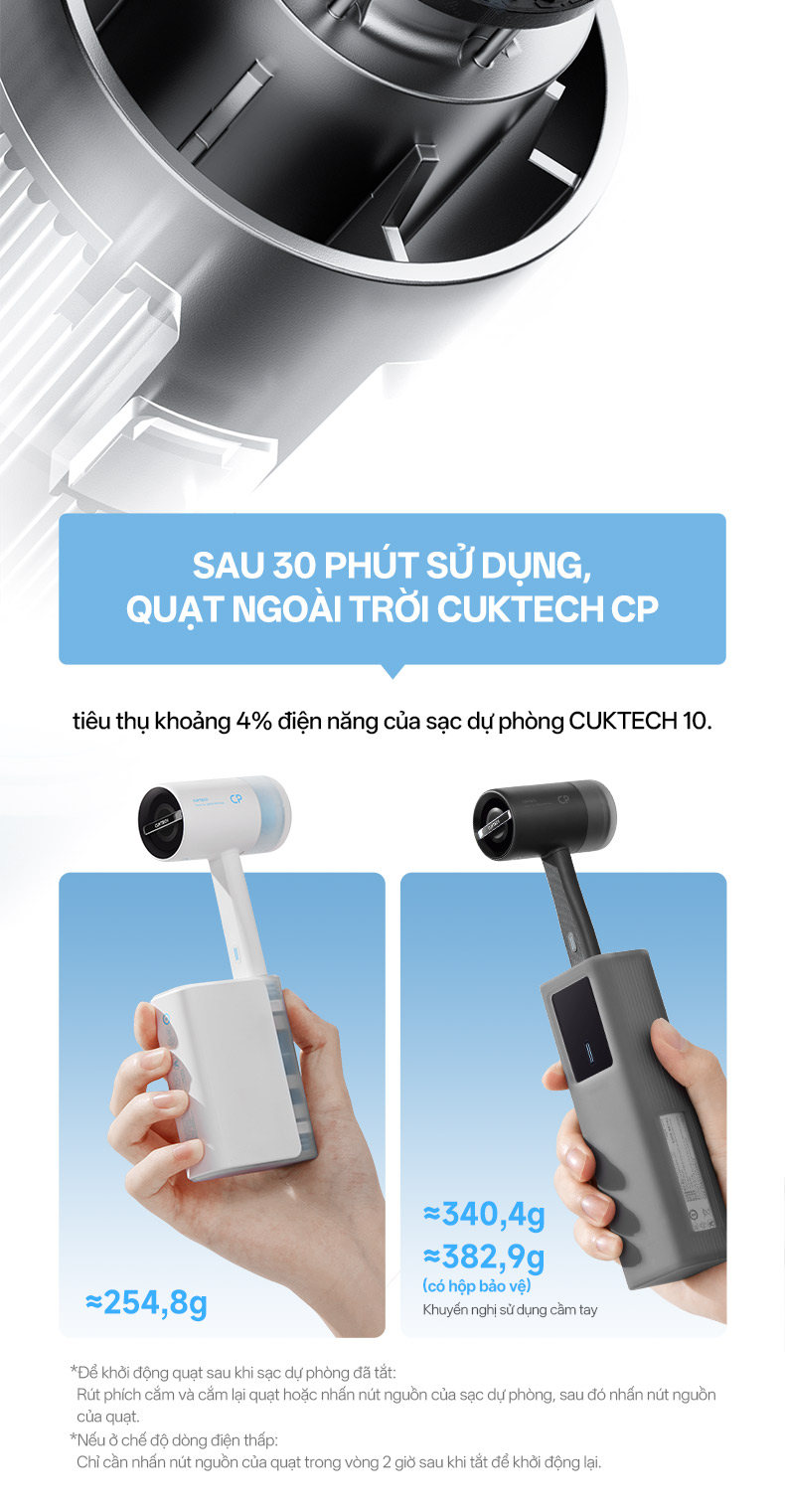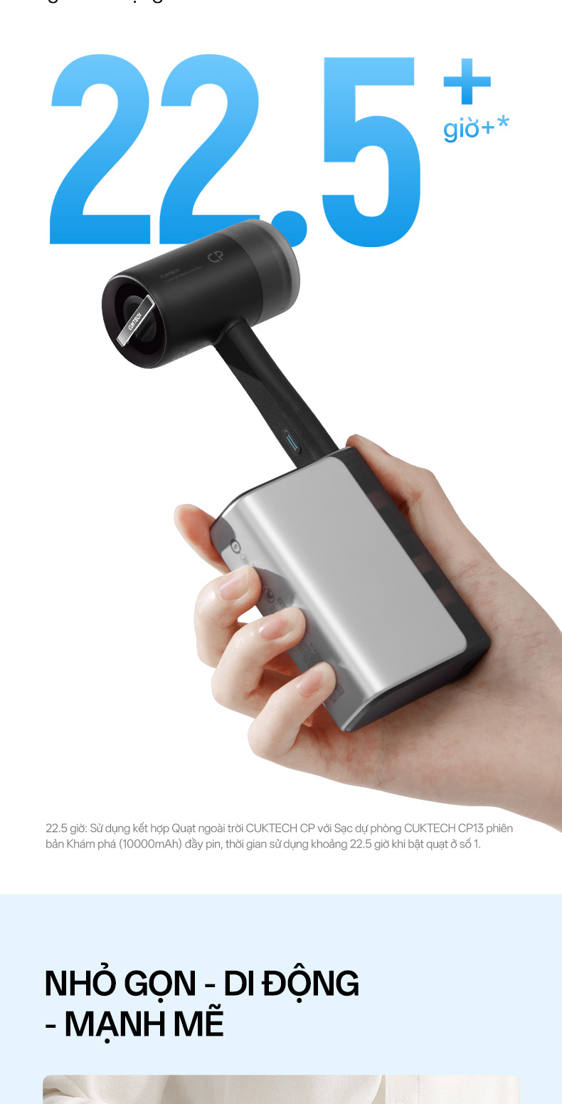 *22,5 giờ: Khi kết hợp với Pin dự phòng Cuktech 10000mAh phiên bản bỏ túi, sạc đầy và bật quạt ở tốc độ đầu tiên, có thể sử dụng trong khoảng 22,5 giờ.