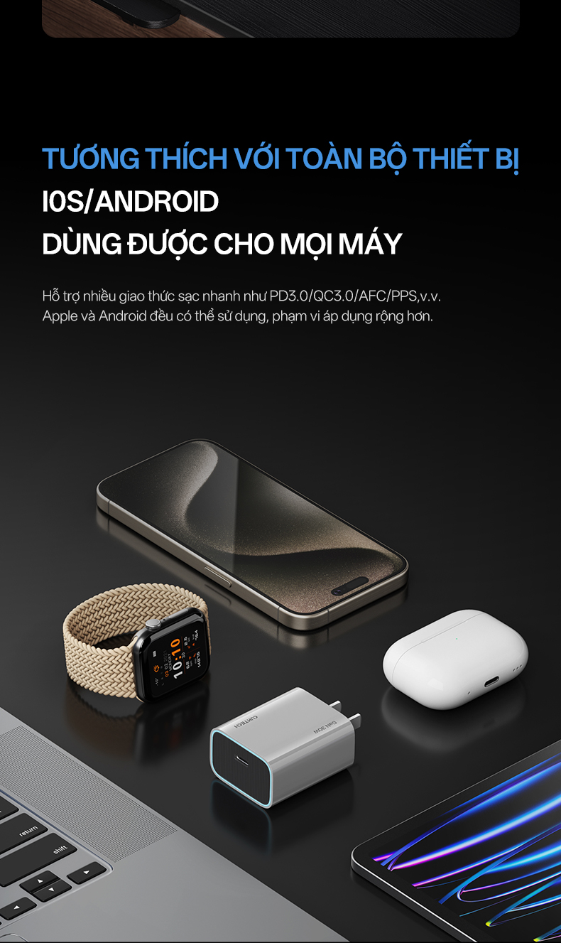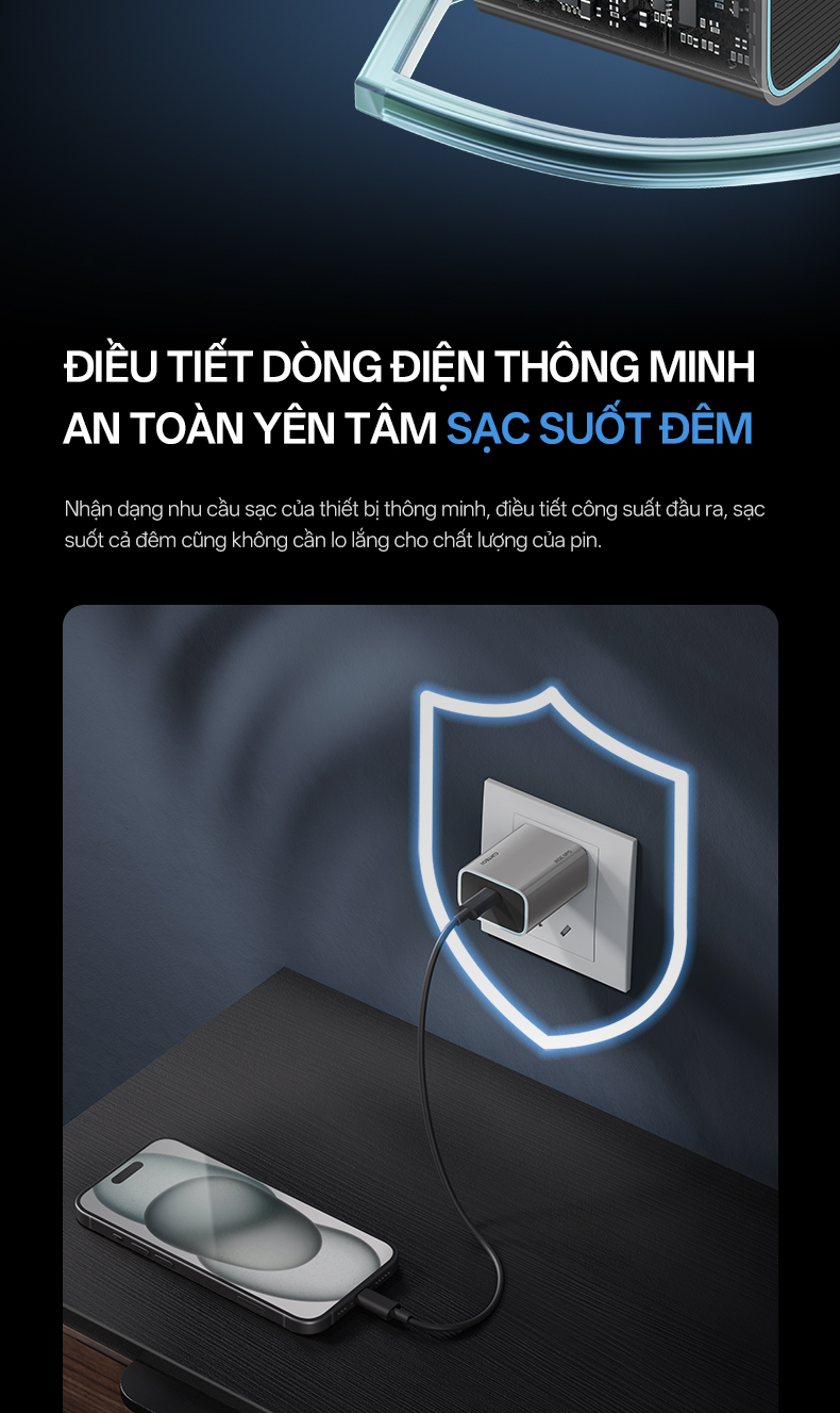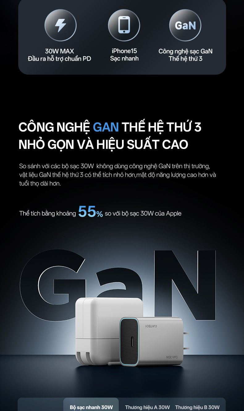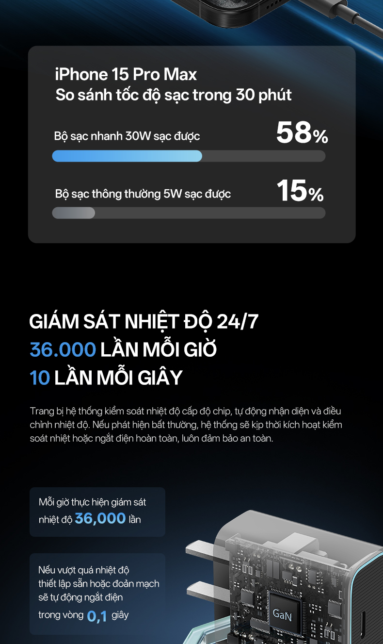 Hơn nữa, công nghệ GaN hiện đại mang đến hiệu suất ổn định và mạnh mẽ trong suốt quá trình sạc. Ngoài ra, với công nghệ này sẽ giúp hạn chế tình trạng quá áp, quá dòng và quá nhiệt trong quá trình sạc.