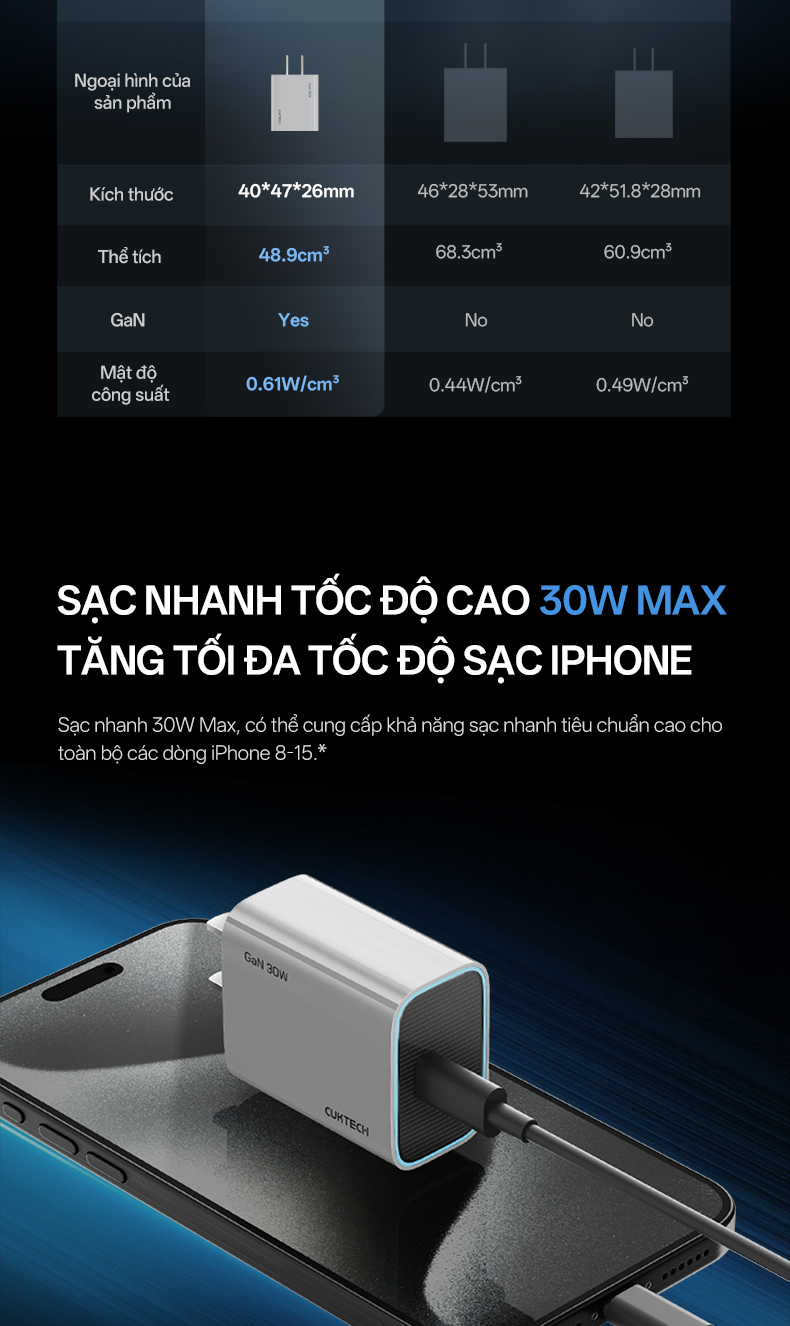 Bộ củ sạc Cuktech GAN 1C 30W kèm cáp C-C (CN) A18C cung cấp công suất tối đa lên đến 30W. Điều này giúp người dùng tiết kiệm thời gian sạc, đồng thời duy trì hiệu suất ổn định cho thiết bị.