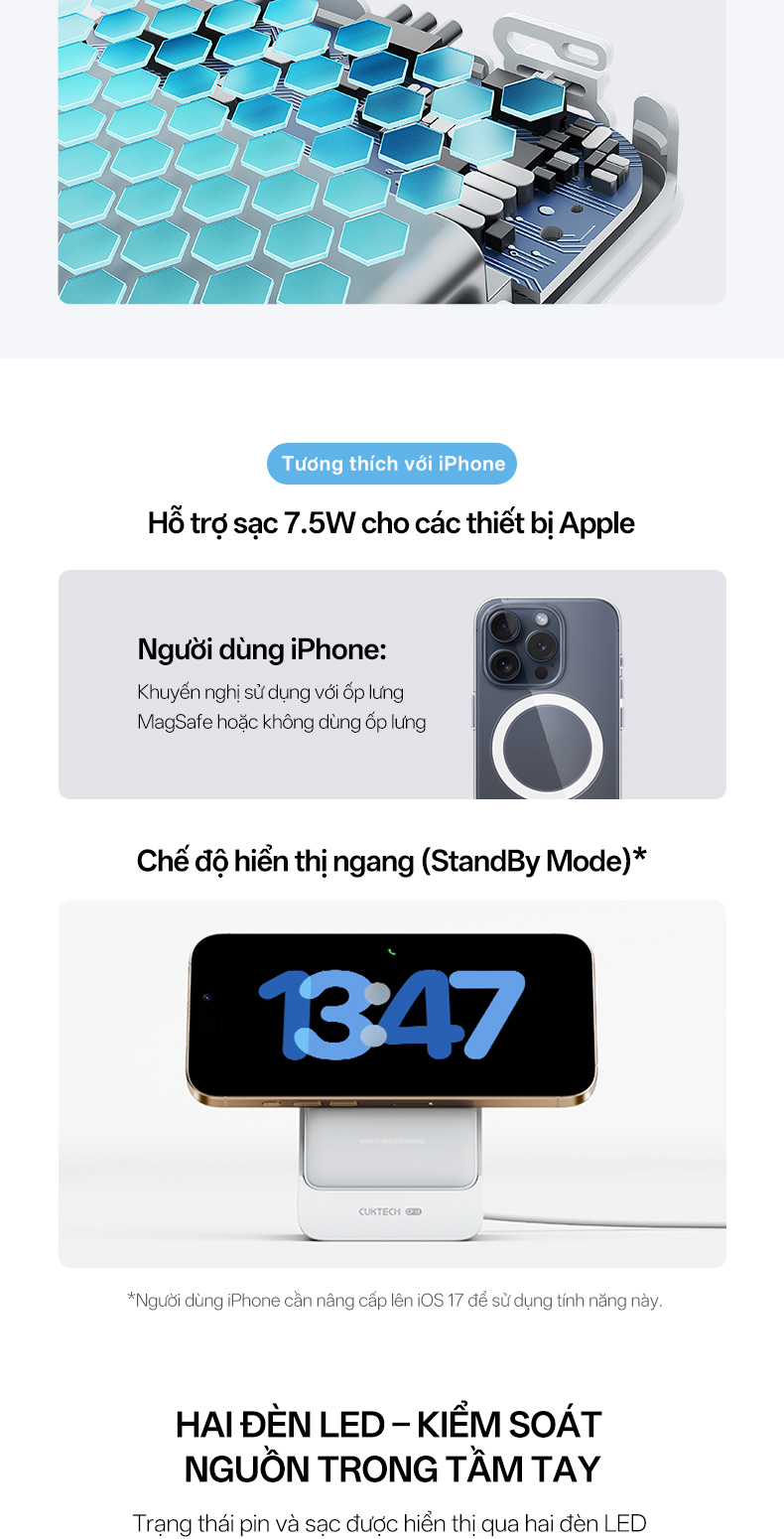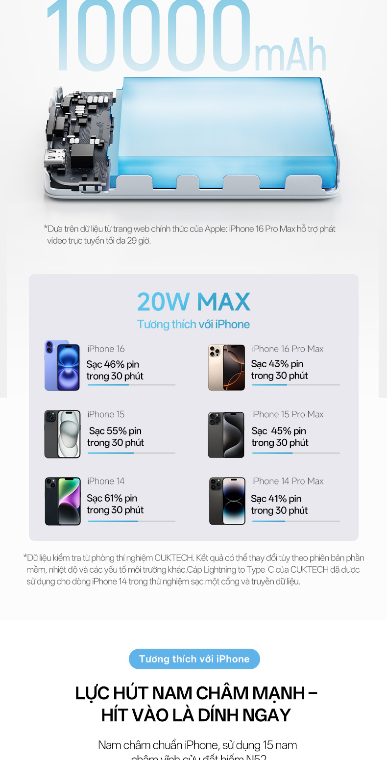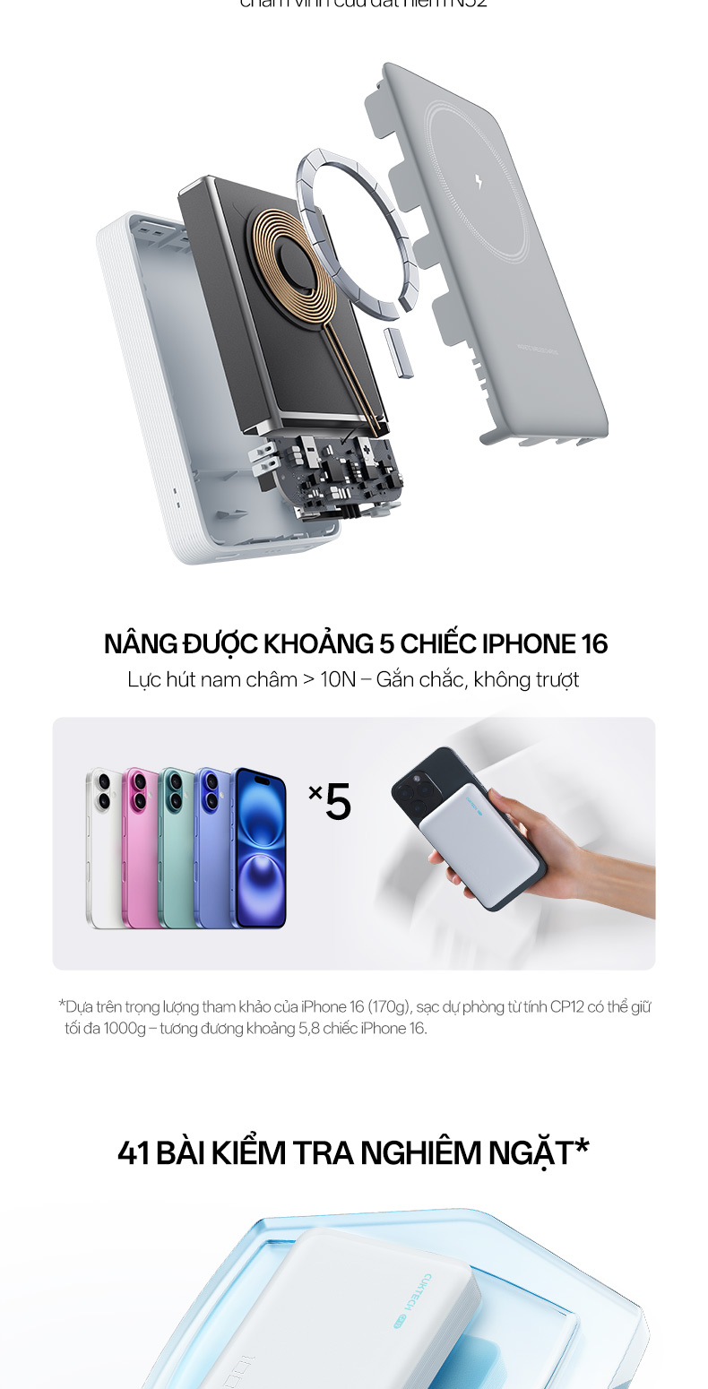 Cuktech WPB100N được trang bị 15 nam châm đất hiếm N52 có lực hút mạnh, giúp cố định chắc chắn điện thoại ngay cả khi di chuyển. Điều này không chỉ tạo sự thuận tiện khi sạc mà còn tránh rủi ro rơi rớt thiết bị. Người dùng có thể dễ dàng đặt điện thoại lên sạc mà không cần căn chỉnh nhiều, đặc biệt phù hợp cho các dòng iPhone từ 12 đến 16 hỗ trợ MagSafe và các thiết bị Android có ốp từ tính.