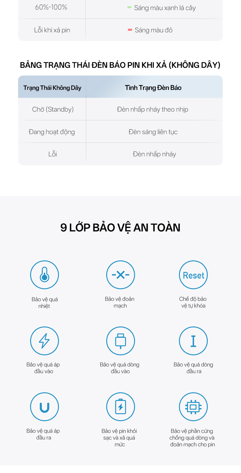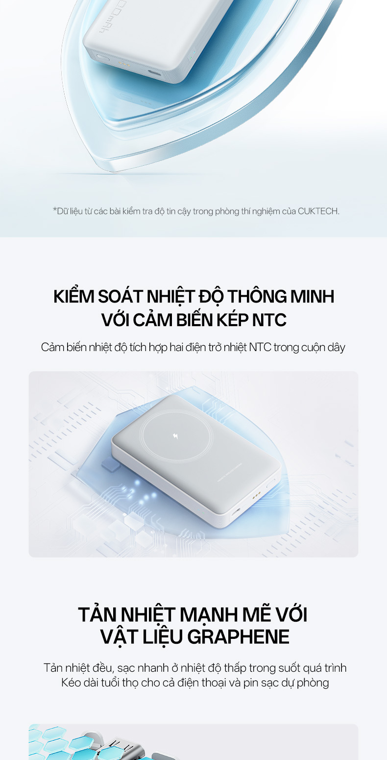 Sản phẩm tích hợp hệ thống Dual NTC giúp giám sát và điều chỉnh nhiệt độ theo thời gian thực. Kết hợp với tản nhiệt graphene, pin sạc dự phòng đa năng này duy trì mức nhiệt ổn định, ngăn chặn tình trạng quá nhiệt, quá dòng và quá áp. Nhờ đó, tuổi thọ pin và thiết bị được kéo dài, đảm bảo hiệu suất sạc luôn ở mức tối ưu.