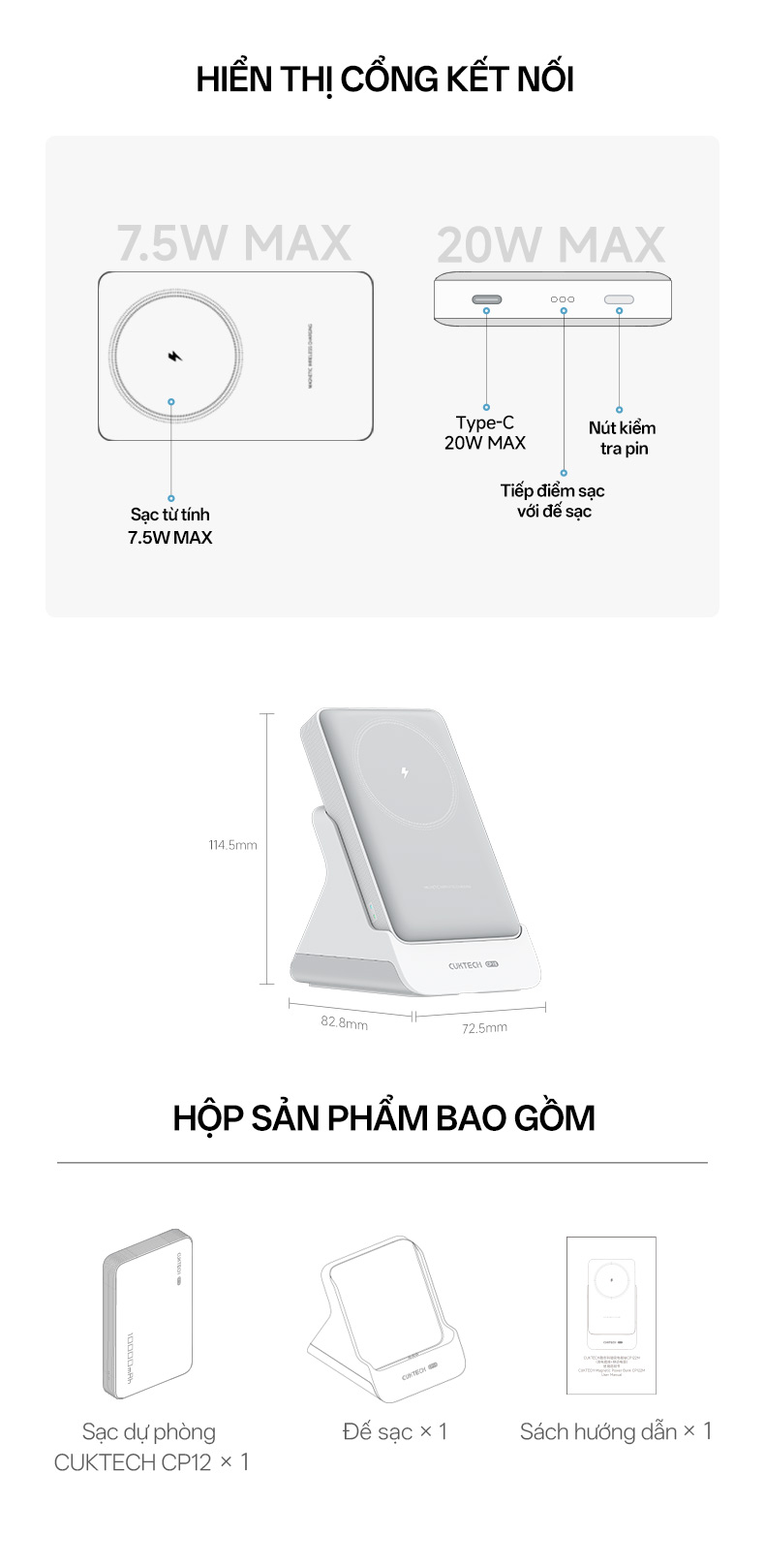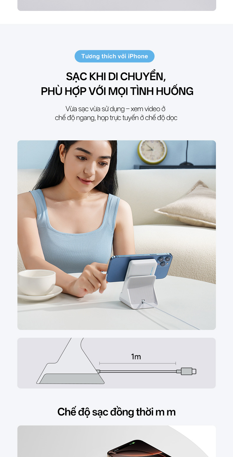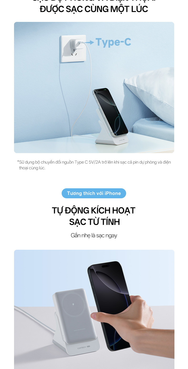 Cuktech WPB100N không chỉ là pin sạc MagSafe mà còn đi kèm một đế sạc thiết kế thông minh. Khi đặt lên đế, sản phẩm có thể trở thành giá đỡ điện thoại với góc nghiêng khoảng 120°, lý tưởng cho việc xem video, họp trực tuyến hoặc học tập. Đây là tính năng giúp tối ưu hóa không gian làm việc và giải trí của người dùng.