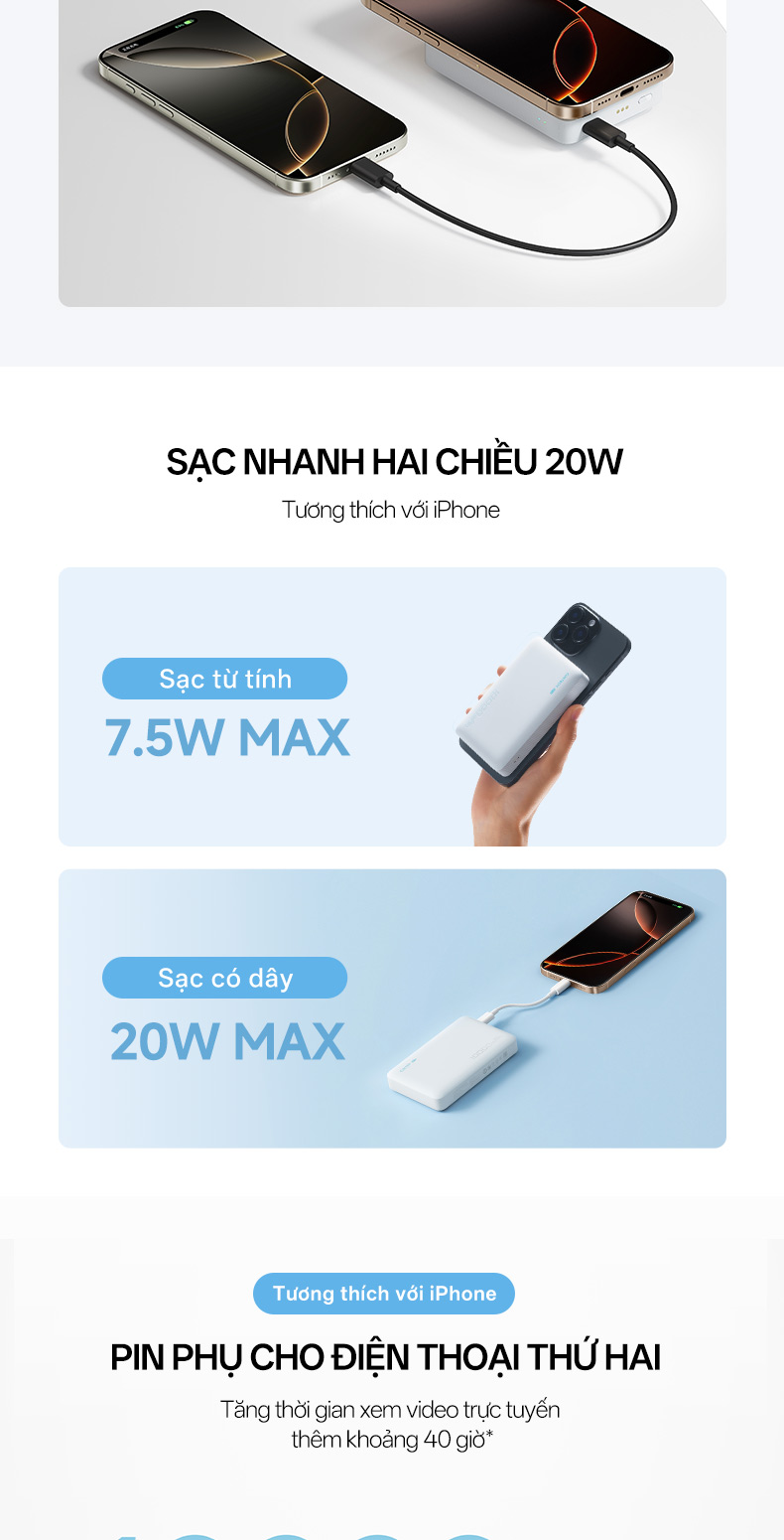 Với dung lượng pin lớn 10.000mAh, sản phẩm có thể sạc iPhone 16 Pro Max đến 1,3 lần hoặc duy trì nguồn năng lượng cho nhiều thiết bị trong cả ngày. Cổng USB-C hỗ trợ sạc nhanh 20W, giúp sạc 46% pin chỉ trong 30 phút, trong khi sạc không dây 7,5W đạt hiệu suất ổn định với công nghệ Qi 1.3.