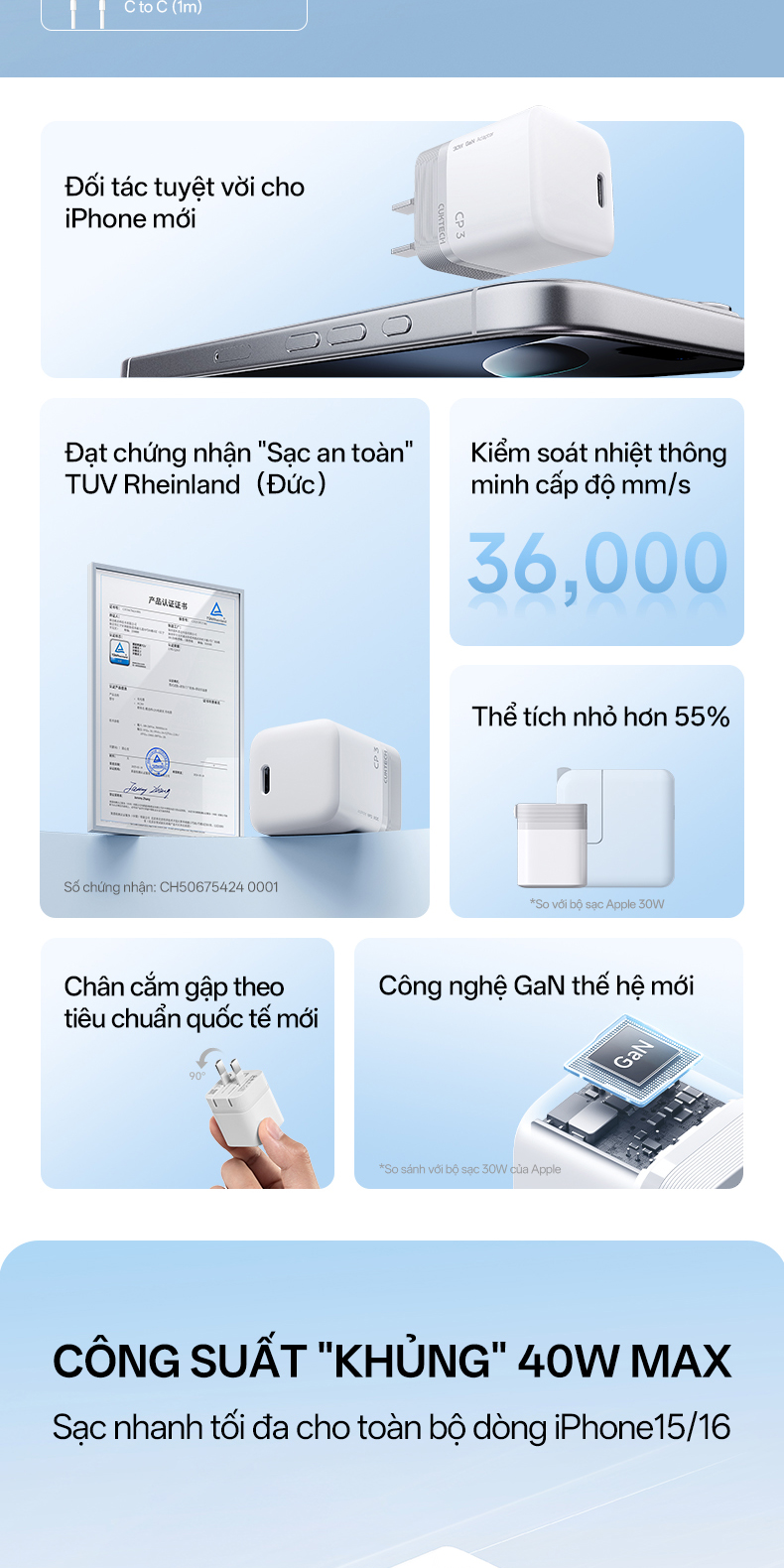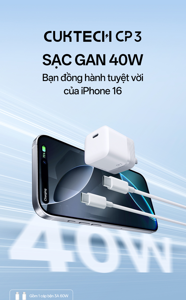 CUKTECH AC301 hay CUKTECH CP3 là củ sạc nhanh mini GaN 40W được thiết kế dành riêng cho người dùng Apple nói riêng và các thiết bị di động hỗ trợ sạc nhanh nói chung. Sản phẩm ứng dụng công nghệ bán dẫn Gallium Nitride (GaN) hiện đại, mang lại hiệu suất sạc cao, thiết kế nhỏ gọn nhưng vẫn đảm bảo an toàn và độ bền vượt trội. Với công suất tối đa 40W cùng chuẩn sạc PD2.0, CUKTECH AC301 đáp ứng tốt nhu cầu sạc nhanh cho iPhone, iPad và nhiều thiết bị điện tử khác, giúp người dùng tiết kiệm thời gian mà vẫn yên tâm về độ an toàn.