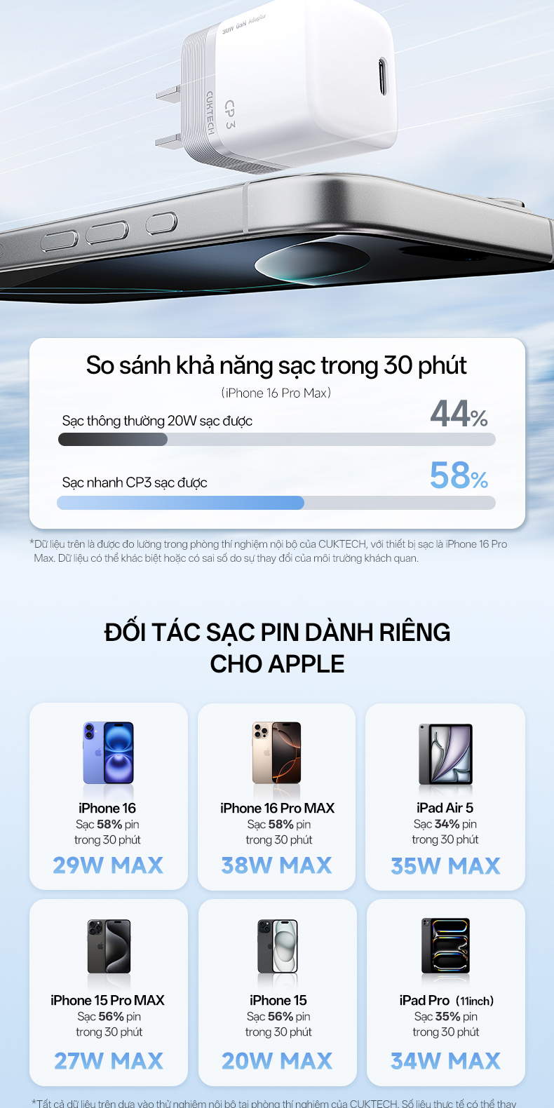 Với công suất tối đa 40W, CUKTECH AC301 cho phép rút ngắn đáng kể thời gian sạc so với các loại củ sạc thông thường. Khi sử dụng với iPhone hoặc iPad, sản phẩm có thể nạp pin từ 0–50% chỉ trong khoảng 30 phút, giúp người dùng nhanh chóng quay lại công việc hoặc giải trí mà không phải chờ đợi lâu. Điểm nổi bật của AC301 không chỉ nằm ở tốc độ mà còn ở khả năng duy trì nguồn điện ổn định, giúp bảo vệ tuổi thọ pin của thiết bị. Nhờ đó, sản phẩm trở thành giải pháp hoàn hảo cho những ai thường xuyên di chuyển, cần một bộ sạc vừa nhanh vừa an toàn.