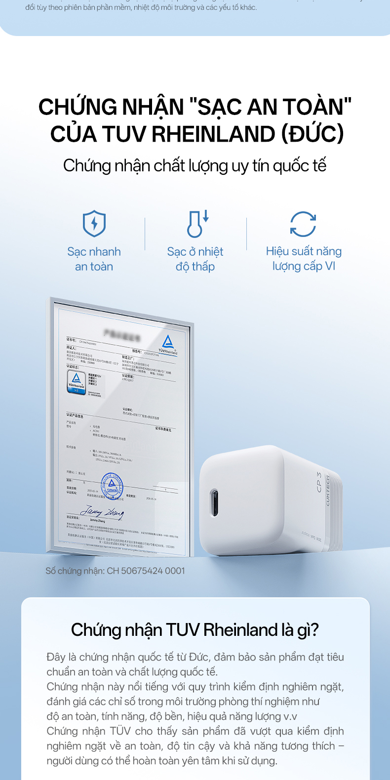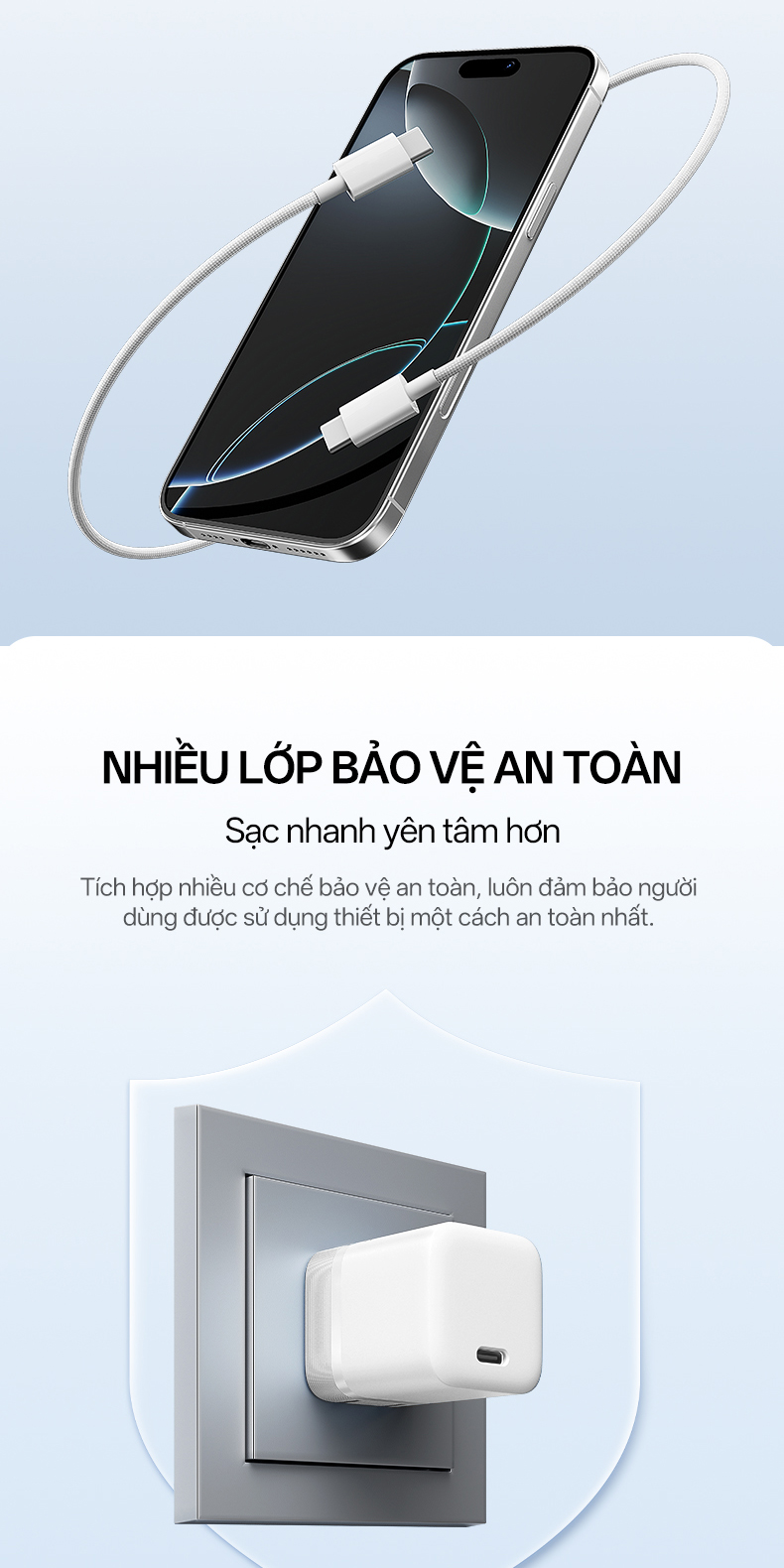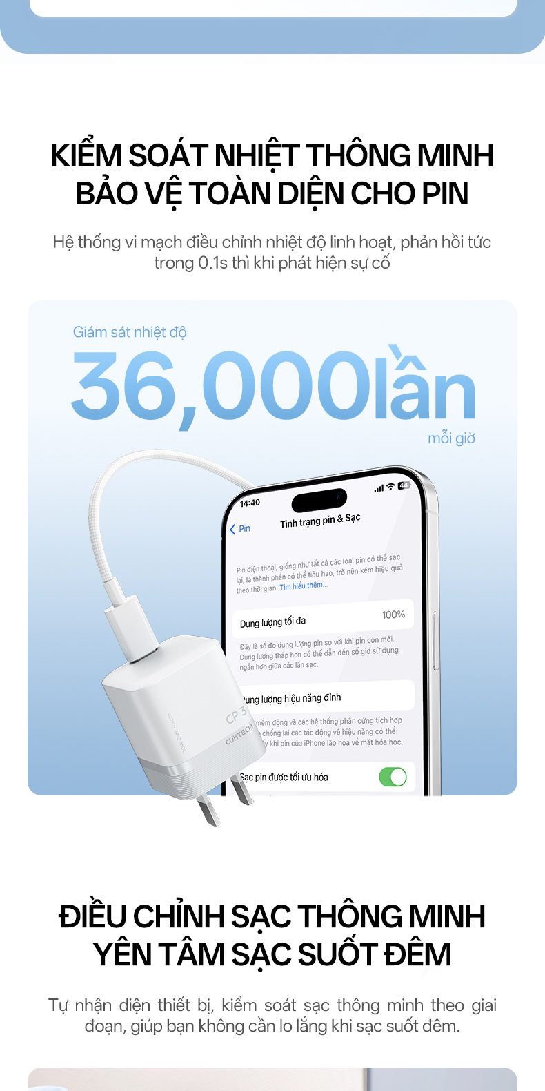 Bên cạnh tốc độ sạc nhanh, yếu tố an toàn luôn được CUKTECH đặt lên hàng đầu. AC301 được trang bị công nghệ kiểm soát nhiệt độ thông minh, giúp tự động điều chỉnh dòng điện khi phát hiện quá tải, quá áp hoặc quá nhiệt. Điều này không chỉ bảo vệ thiết bị đang sạc mà còn kéo dài tuổi thọ của chính củ sạc. Người dùng có thể hoàn toàn yên tâm khi sạc qua đêm hoặc sử dụng trong nhiều môi trường khác nhau. Hệ thống bảo vệ đa lớp giúp ngăn ngừa rủi ro cháy nổ, đảm bảo trải nghiệm sử dụng an toàn và ổn định lâu dài.