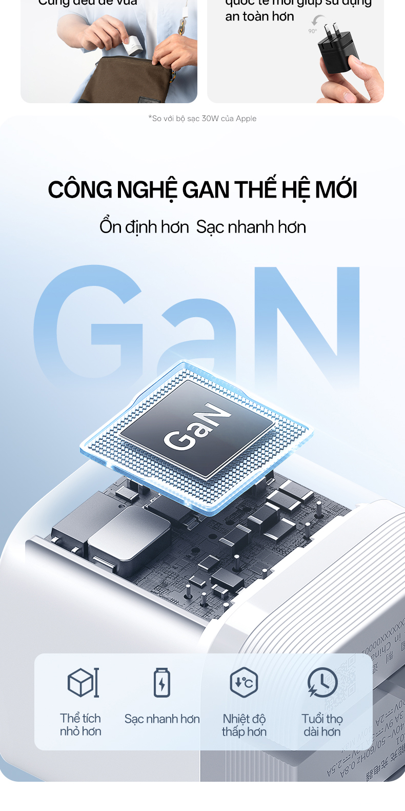 | Vật liệu | Gallium Nitride (GaN) – tản nhiệt tốt, kích thước nhỏ gọn |