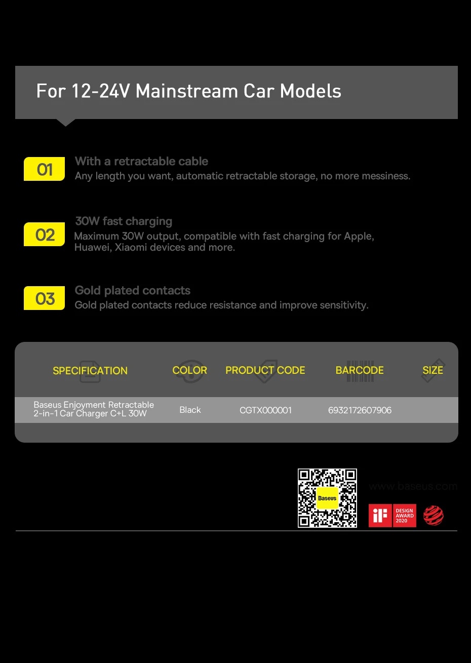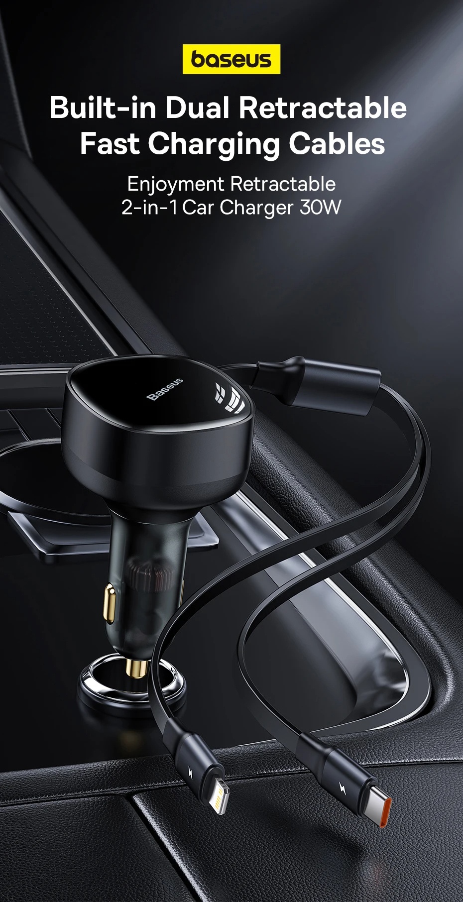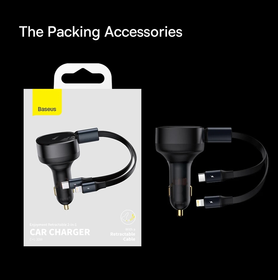 - Tẩu Sạc Kèm Cáp Công Suất Cao Baseus Enjoyment Retractable 2 in 1 được ra mắt năm 2022, thể hiện bước tiến mới trong lĩnh vực phụ kiện xe hơi của nhà Baseus . Được thiết kế kèm cáp dây rút đa năng với 2 đầu Type C và Lightning, có thể thu gọn khi không sử dụng giúp cho không gian trên xe hơi của bạn trở lên gọn gàng hơn, thẩm mỹ hơn và sang trọng hơn.