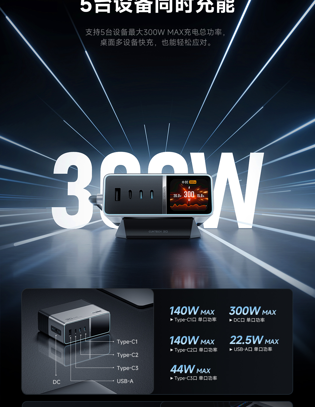 Hỗ trợ sạc đồng thời 5 thiết bị với tổng công suất cực đại 300W.